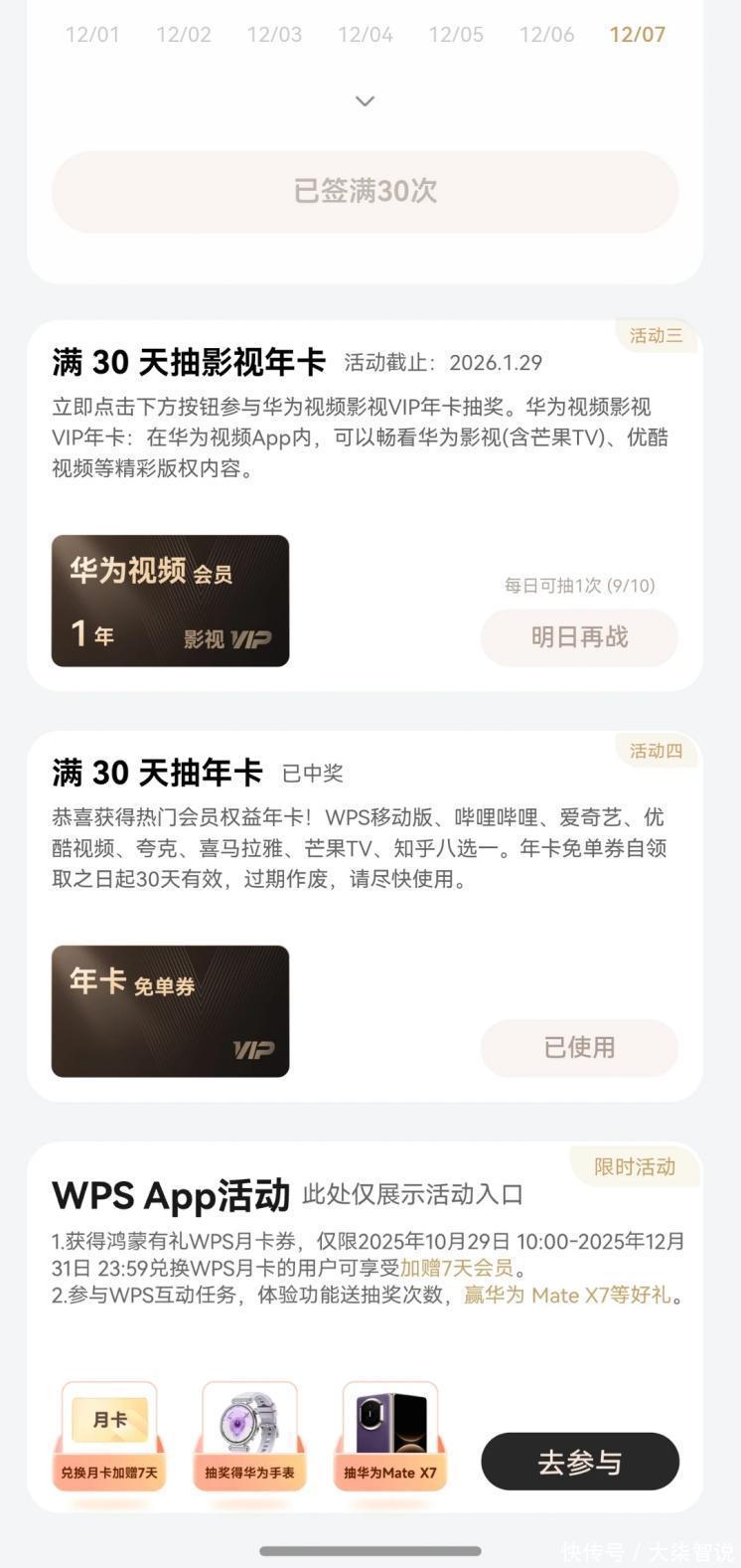 更绝的还在后面。首次签到后的第30天起就能抽“影视VIP年卡礼包”,抽中直接抱走华为影视会员12个月+优酷小屏会员12个月双会员,双重追剧快乐一次拿捏。